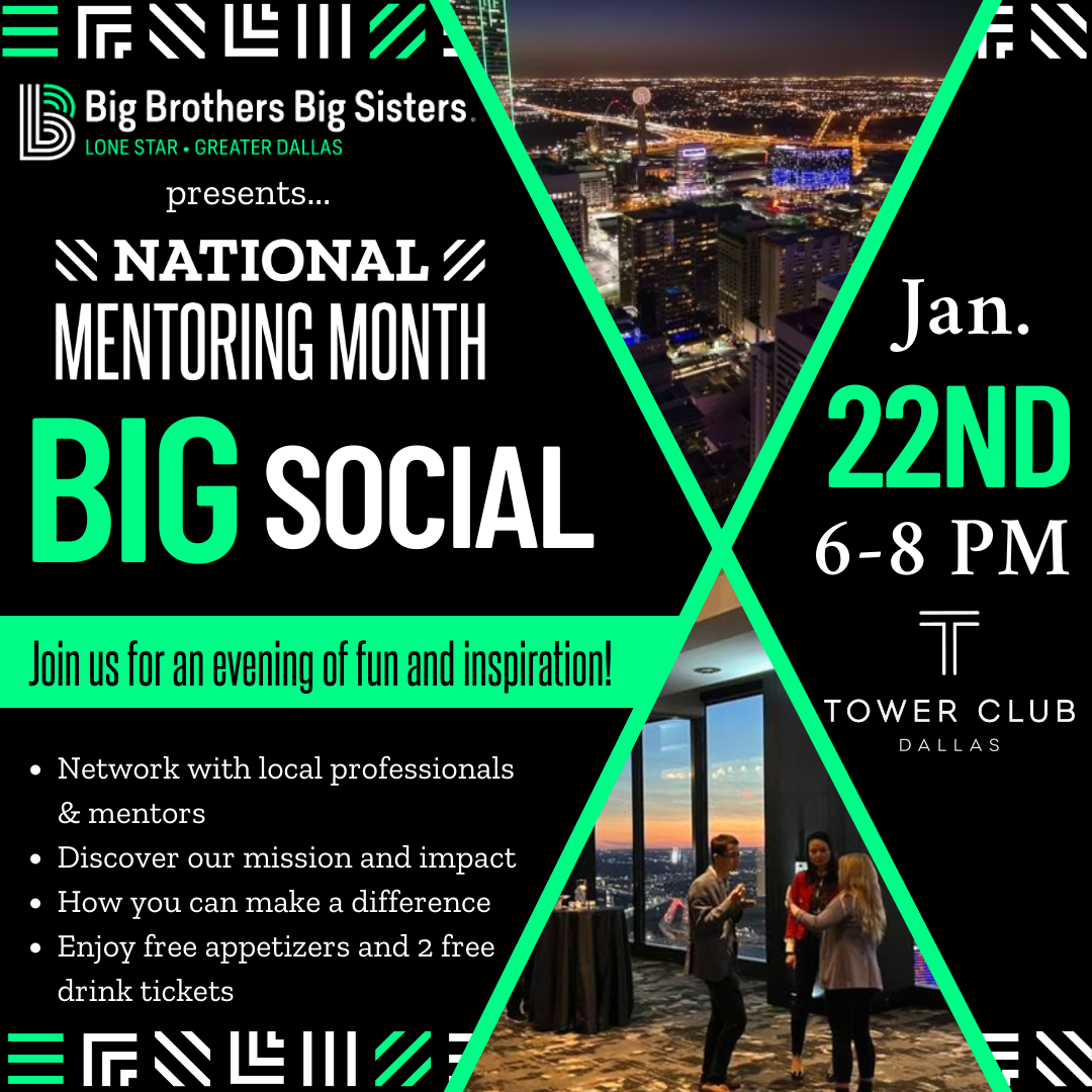 Ready to mix, mingle, and make a BIG impact? Join us for Big Brothers Big Sisters’ BIG Social at Tower Club Dallas on Thursday, January 22, 2026, from 6–8 PM!